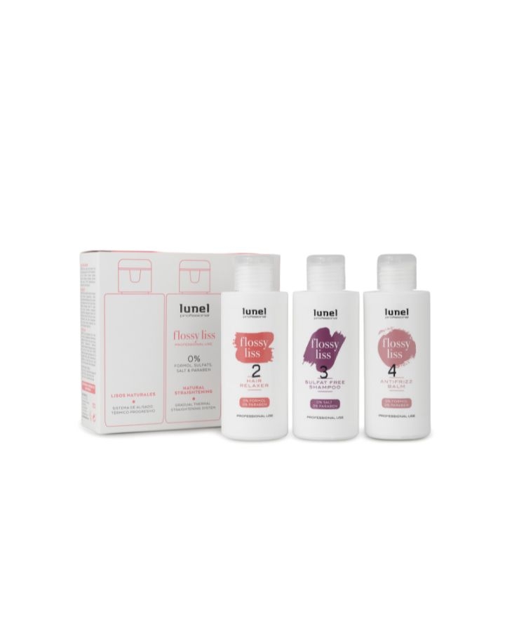 Flossy Liss Kit with Sulphate-Free Shampoo, Hair Relaxer and Anti-Frizz Balm.